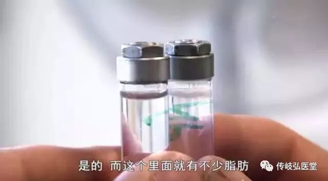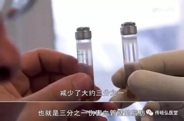 跟吃早餐前的血液样本一做对比,就能很明显看出右边试管里的脂肪层更厚。